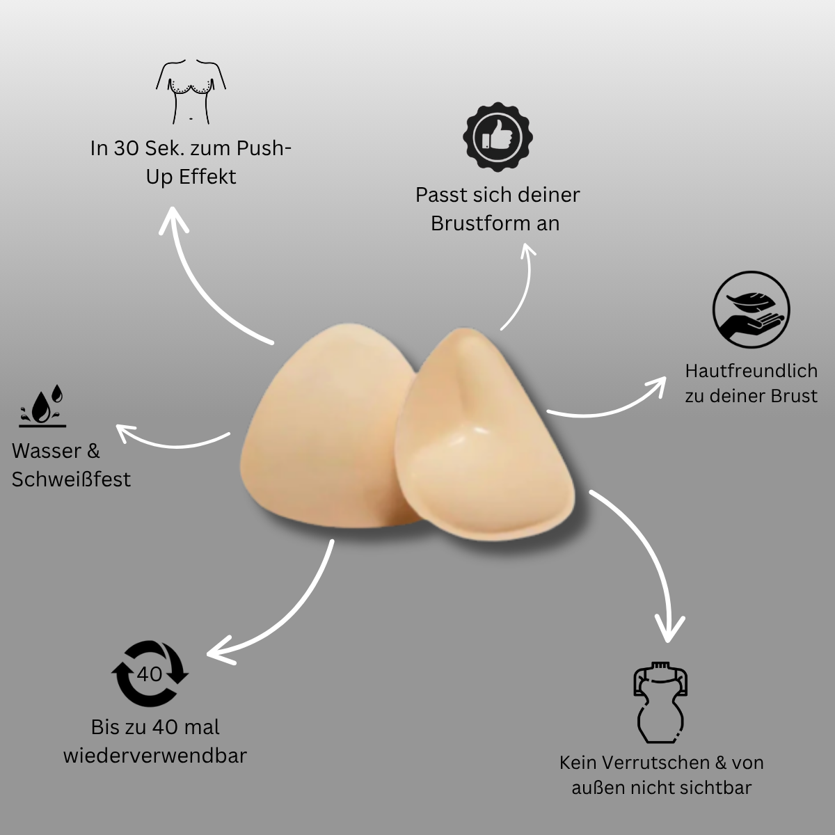 Mit PushPads erzielst du in nur 30 Sekunden einen beeindruckenden Push-up-Effekt, der sich ganz natürlich deiner Brustform anpasst. Dank hautfreundlicher Materialien und innovativem Design sitzt alles sicher – kein Verrutschen, kein Abzeichnen von außen. Unsere Pads sind schweiß- und wasserfest, für jedes Abenteuer geeignet und bis zu 40-mal wiederverwendbar. So genießt du ein pralles Dekolleté, optimalen Halt und ein angenehmes Tragegefühl – immer dann, wenn du es möchtest.